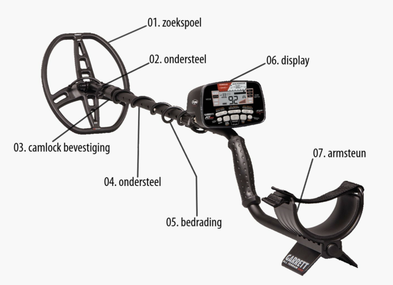 Zoals je kunt zien bestaat de metaaldetector grofweg uit 7 onderdelen. We rekenen dan uiteraard de binnenkant van het functiehuis met display niet mee. We gaan de werking eens op een simpele manier toelichten.