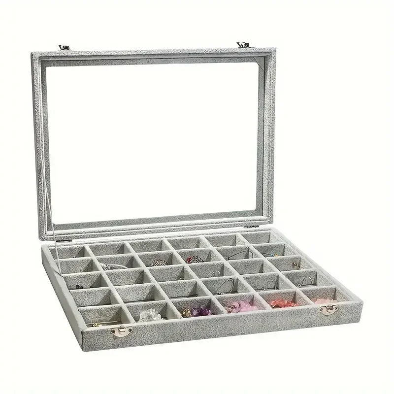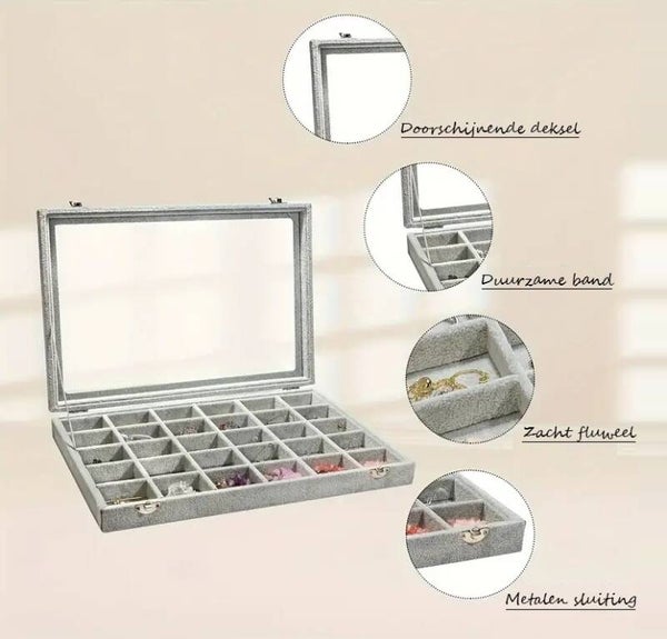 De moderne fluwelen vondstenbox in de kleur grijs, met transparante deksel, heeft een 30-vaks indeling en een metalen gespsluiting. Deze zogeheten displaybox is ideaal om uw gevonden munten of andere kleinere objecten in tentoon te stellen.