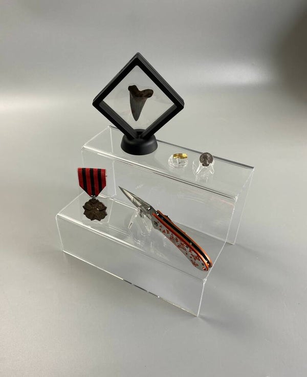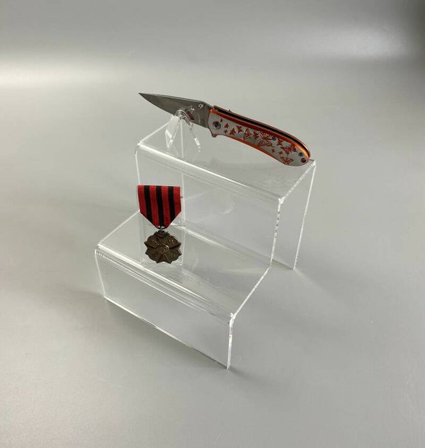 Prachtige Riser met twee treden. Deze trapsgewijze verhoging is een geweldige manier om, bijvoorbeeld in een vitrine, historische objecten op verschillende hoogtes weer te geven. Gemaakt van 4 mm dik glashelder acryl.
