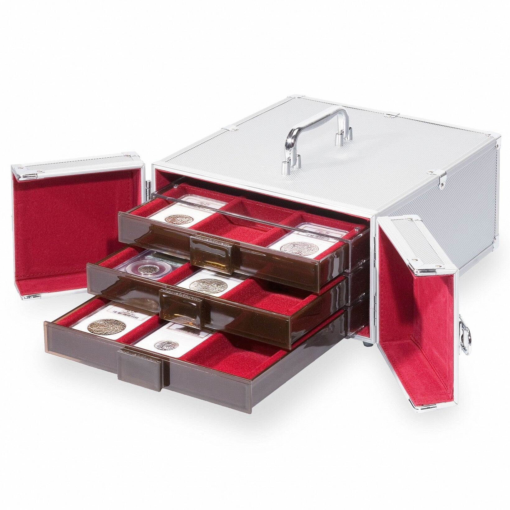 Aluminium coin case voor maximaal 5 munten boxen of 3 XL munten boxen. Bekleed met donkerrode velours, afsluitbaar (twee sleutels), stevig en makkelijk mee te nemen. Met scharnierend handvat, metalen hulpstukken en tekstveld voor een label.