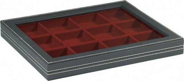 Bij deze veelzijdige Nera M 2367 muntcassette met zichtvenster heeft u de mogelijkheid om te kiezen uit een veelvoud van rode, donkerrode, blauwe of zwarte velourse inlay uit de gehele collectie muntenboxen. Afmeting 298 x 243 x 35 mm.