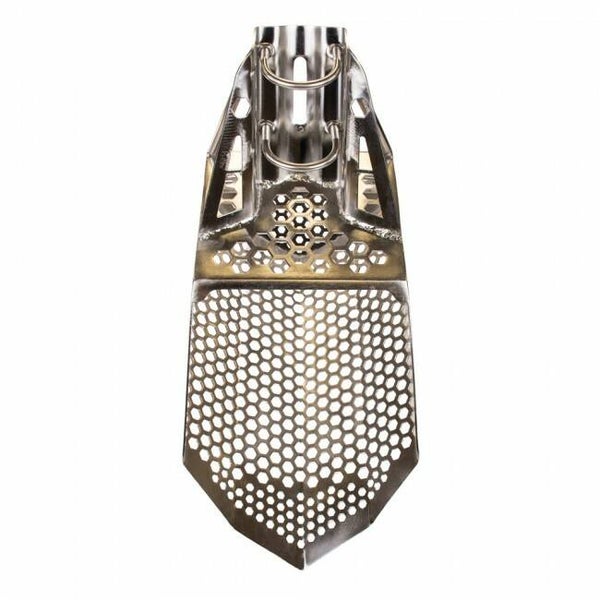 De Quest Scoopal RVS waadschep zonder steel met de afmetingen 30 cm x 14.5 cm x 12 cm 1.5 mm en een plaatdikte van 8 mm met 6 hoekige gaten.
