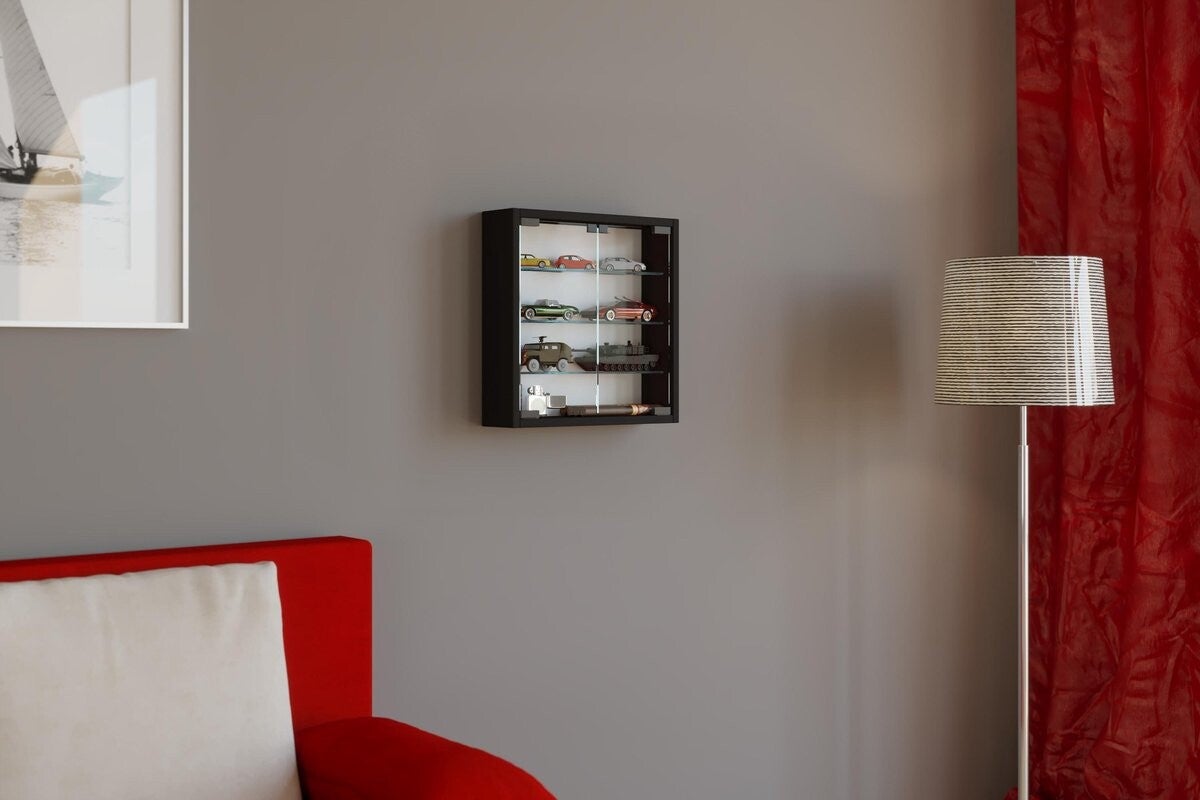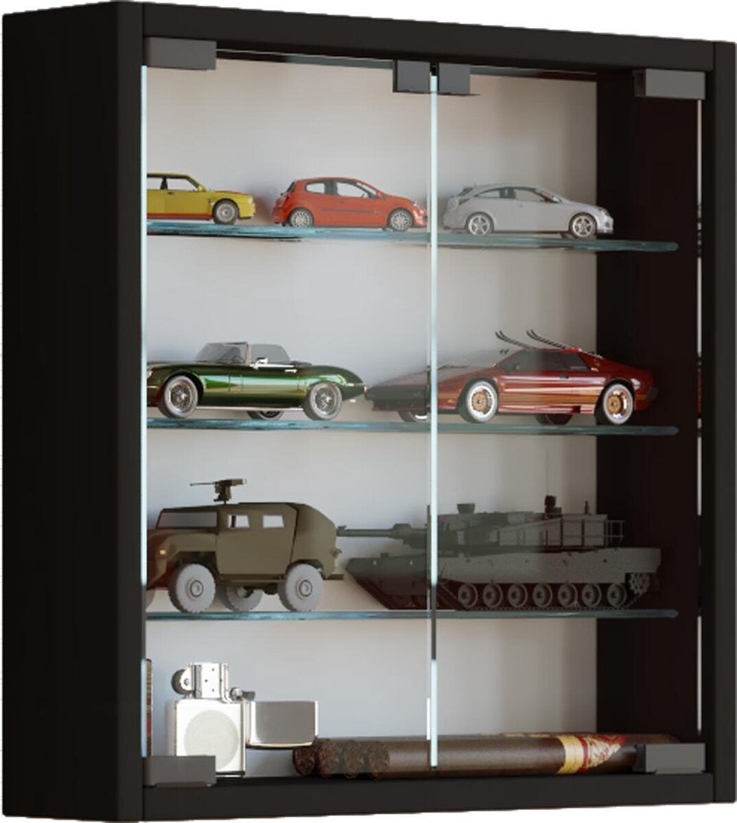 De basis van dit kleine zwarte vitrinekastje bestaat uit hout met een stabiele achterwand en 3 doorzichtige glasplanken en twee mooi afgewerkte glazen deuren. De glazen deuren en glazen legplankjes bestaan uit ESG-veiligheidsglas. Door eenvoudige wandmontage zowel te gebruiken als wandvitrine of als een staande vitrinekast.