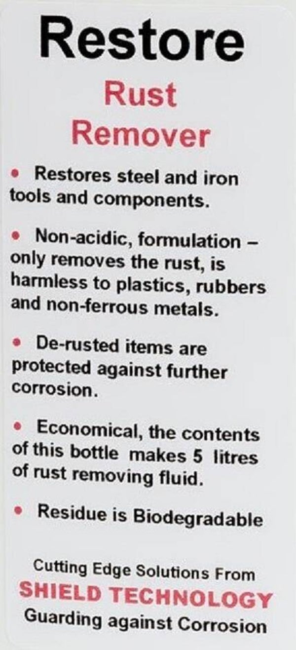 Restore Rust Remover is een niet zuurhoudend, niet toxisch en biologisch afbreekbaar ontroesteringsconcentraat op waterbasis. De inhoud van de 250 ml fles, gemengd met leidingwater, maakt 5 liter herbruikbare vloeistof (ongeveer 1 gallon).